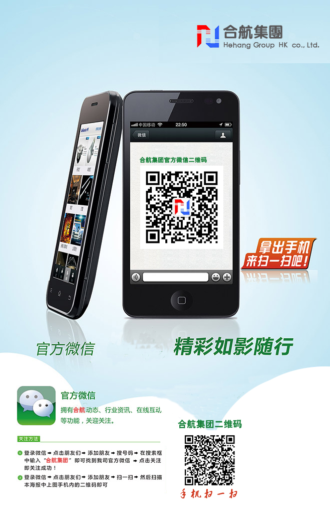 關注方法一:拿出手機,登錄微信--點擊朋友們--添加朋友--搜號碼--在搜索框輸入“合航集團”即可找到我司官方微信--點擊關注,即關注成功!